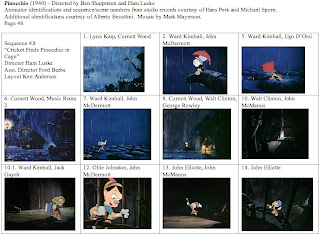 Addendum to Part 13A: There's been discussion about Shamus Culhane's animation of Honest John and whether or not he was unfairly deprived of credit. I have no more information on that, but on page 145 of The Animated Man: A Life of Walt Disney by Michael Barrier, Hugh Fraser is quoted as to how he did 48 pencil tests of sequence 7, shot 30. Culhane claimed to have worked on sequence 7, where Honest John and Gideon plot with the coachman, and while Fraser's scene was probably an extreme case, it's possible that Culhane's scenes were also revised numerous times after he left by Norm Tate, leaving little or nothing of Culhane's work. T. Hee was the sequence director of sequences 3 and 7, both of which Culhane claimed to have worked on, so Hee may be more responsible than Walt Disney for Culhane not getting credit in the drafts or on the film.