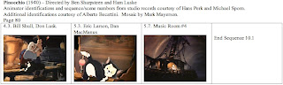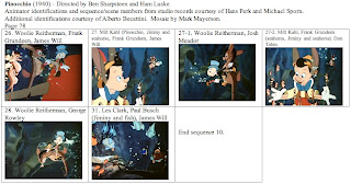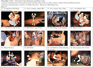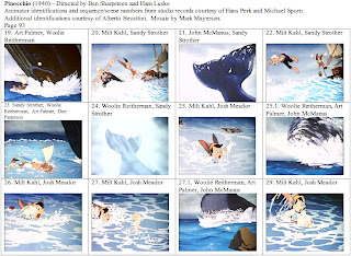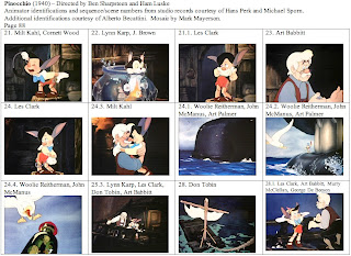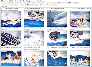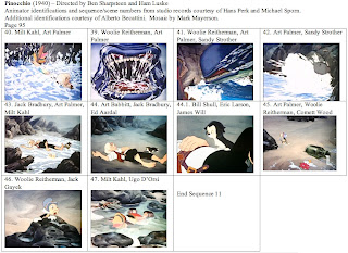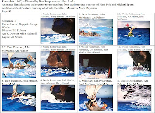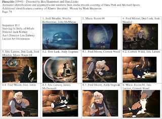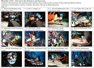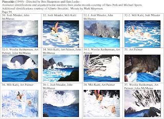This is probably my last post on Pinocchio, at least as part of this series. I want to thank Hans Perk and Michael Sporn again for supplying the animator draft. While I've never had any contact with Alberto Becattini, I owe him a thanks for his database of animators. Many of the less well-known animators and effects animators on Pinocchio were new to me and Becattini's database allowed me to make intelligent guesses as to first names.