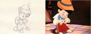 Will Finn published a rough of what he says is an early version Pinocchio as a real boy. I've placed it next to a frame from the film that seems to be the closest to the pose. The differences are not all that striking. The shape of the nose is definitely different, as are the pupils. The cheek and jaw line in the rough is softer and more appealing than in the final frame.